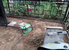 Выложенную брусчатку замыли водой, одновременно смываю строительную пыль, которая в процессе работы осела на оградке и памятниках.