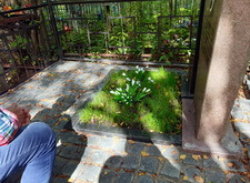 Затем мы застелили территорию участка геотекстилем, который необходим для того, чтобы предотвратить прорастание травы сквозь швы между плитками брусчатки. Параллельно с покрытием мы установили цветник, приподняв его значительно выше над землёй.