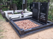 Возвращаем надгробья на место, укрепив подставку двумя рядами брусчатки. По периметру участка ставим гранитный цоколь, в качестве наземного покрытия остальной территории используем кору.